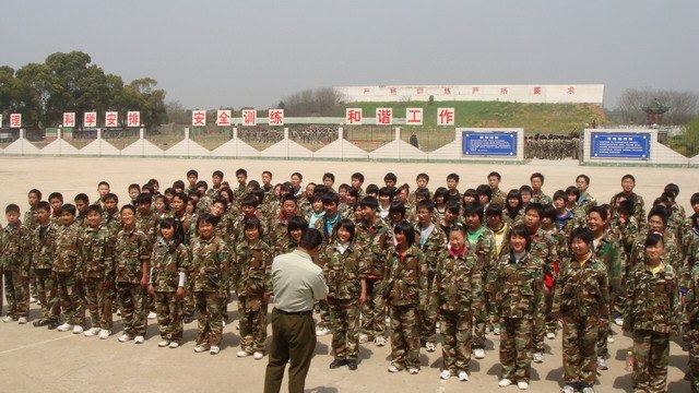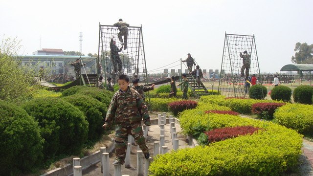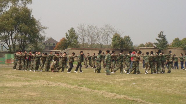进入花山国防教育基地,同学们都换上了迷彩服。顿时男生们一个个英气勃勃,秀气的女生也变成了英姿飒爽的女战士!大家在教官的带领下,有的迈着整齐划一的步伐,高喊着1、2、3、4,开始了队列训练;有的身手矫健地攀爬障碍,尝尝穿越火线的滋味;有的围坐成一圈,铿锵激情地拉起了军歌……一时间练兵场上哨声起伏,人声鼎沸,队列纵横,一派热火朝天的景象。