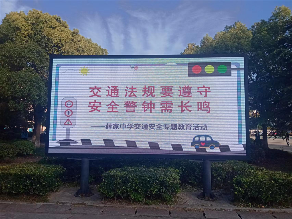 活动期间,学校充分利用显示大屏,滚动播放有关交通安全的警示标语,时刻提醒大家要谨记交通规则;悬挂横幅,增强同学们交通安全意识、法治意识和规则意识。