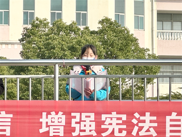 国歌声中,新团员宣誓入团,并用宪法宣传作为入团纪念。新团员们告诉大家12月是我们的“宪法宣传月”,今年的12月4日是第九个国家宪法日,也是我国现行宪法公布施行40周年。本次宣传活动的主题为“学习宣传贯彻党的二十大精神,推动全面贯彻实施宪法”。他们以新颖的形式向学生们详细介绍了宪法的相关知识,用通俗易懂的语言让学生们了解宪法、法律的概念、作用和意义,以及自身的责任和义务。着重讲解了依法治国的重要意义,让学生们对弘扬宪法精神、树立宪法权威的重要性有了深刻的认识。同时,宣讲普及《民法典》《未成年人保护法》等与未成年人相关的法律法规知识,教育引导学生尊法守法、学会运用法律武器维护自身权益,进一步巩固了以前的学习效果。
