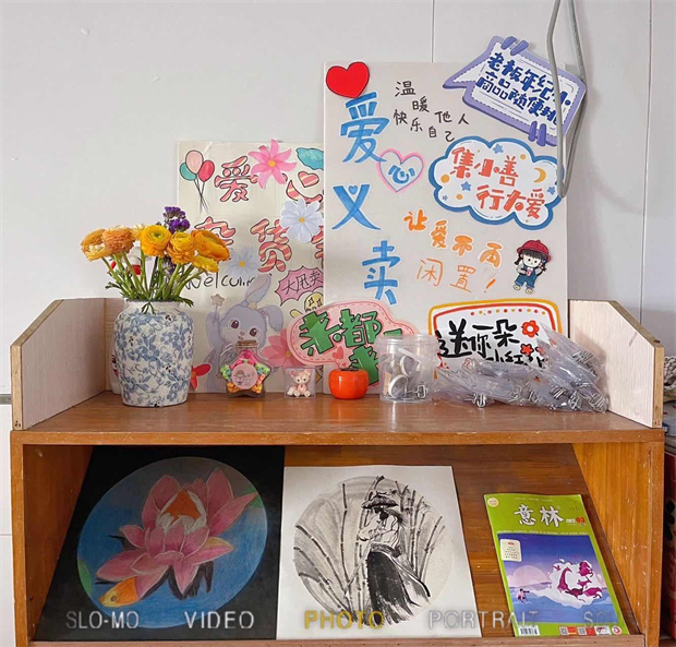 活动前,在班主任的带领下,同学们集思广益,设计好各种促销标语、准备好宣传海报,精心布置摊位,采用各种方法吸引师生目光。活动现场许多图文并茂的广告牌更是夺人眼球:“小市场,大获收,限时抢购”、“爱心杂货铺大甩卖”、“集小善行大爱,让爱不再闲置”,这些别具一格的宣传道具在春日的暖阳下熠熠闪光,凝聚了孩子们天马行空的创意智慧和温暖诚挚的拳拳爱心。