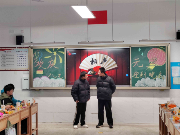 活动前,各班进行了充分的准备工作。看!一串串灯笼挂在门前,一副副窗贴贴在窗上,整个八、九年级都弥漫着喜庆的气氛。走进教室,那可更不得了,大红气球搭着金丝带团簇着,丝制彩带悬挂在头顶,黑板上端正的字迹变成了活泼有趣的祝福。学生们一个个喜气洋洋,或鼓着脸吹气球,或张罗着几个人一起搬桌子,最神秘的还是在角落排练着表演的同学们。
